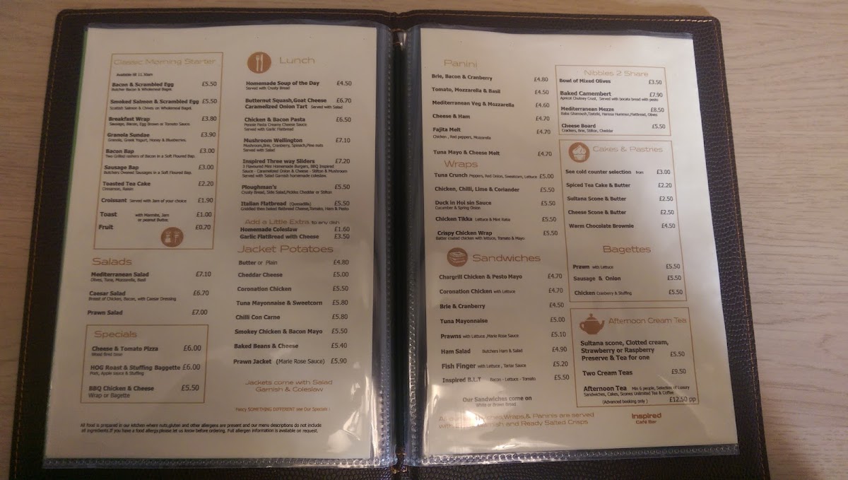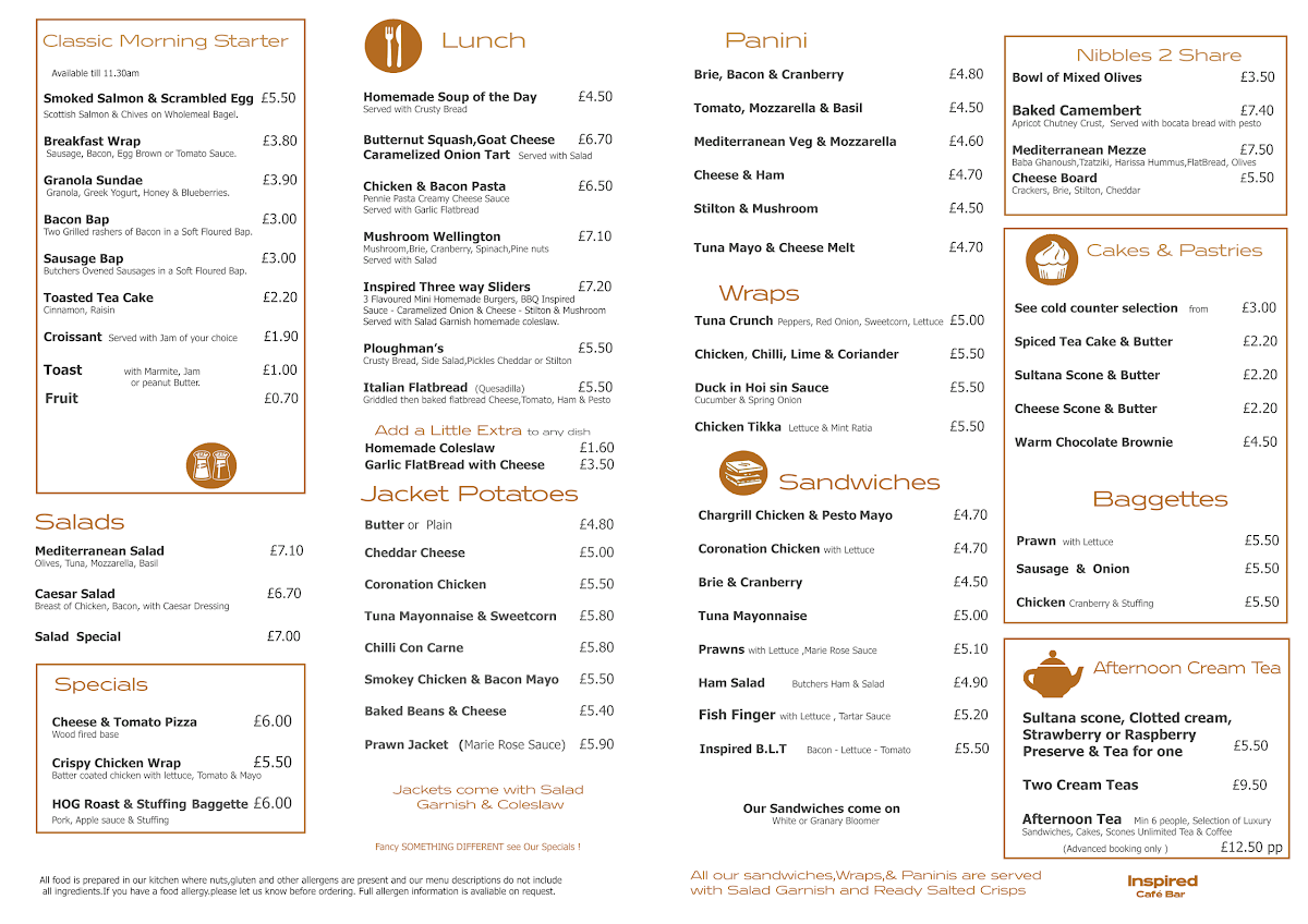 The Kitchen at Inspired prides itself on serving up a variety of fresh, appetizing dishes that cater to all tastes. For lunch, you can treat yourself to the Homemade Soup Of The Day, a warm embrace in a bowl that captures the essence of comfort food. If you're in the mood for something heartier, dive into the Chicken & Bacon Pasta or relish the exquisite Mushroom Wellington. For a taste of British tradition, the Ploughman's platter never disappoints, featuring an assortment of cheeses, pickles, and crusty bread. Don’t miss out on the Inspired Three Way Sliders, which perfectly showcase a medley of flavors in bite-sized portions. If you're looking to nibble, their Italian Flatbread is an excellent choice that pairs perfectly with their hot beverages.